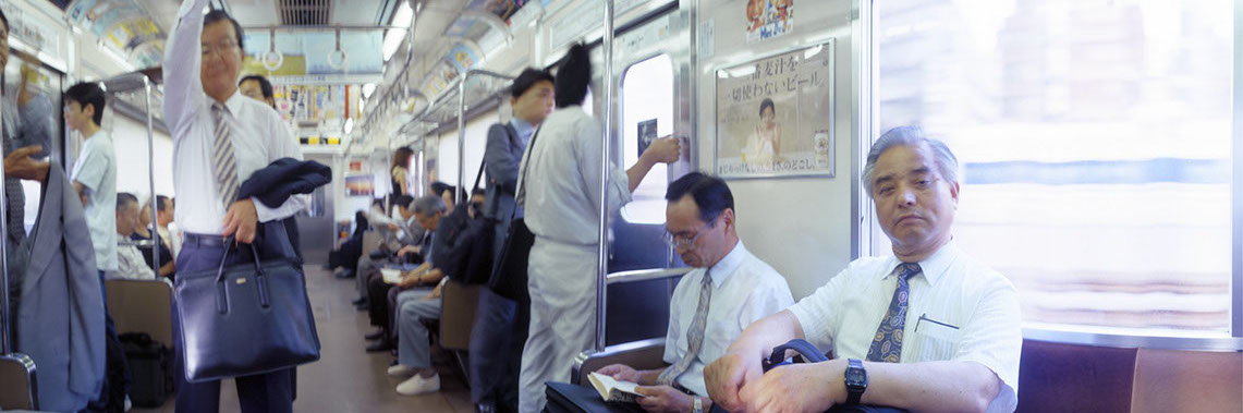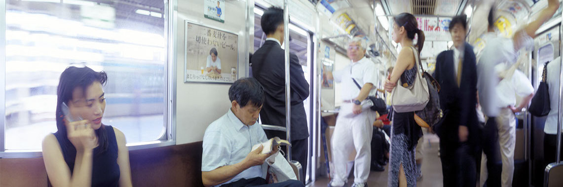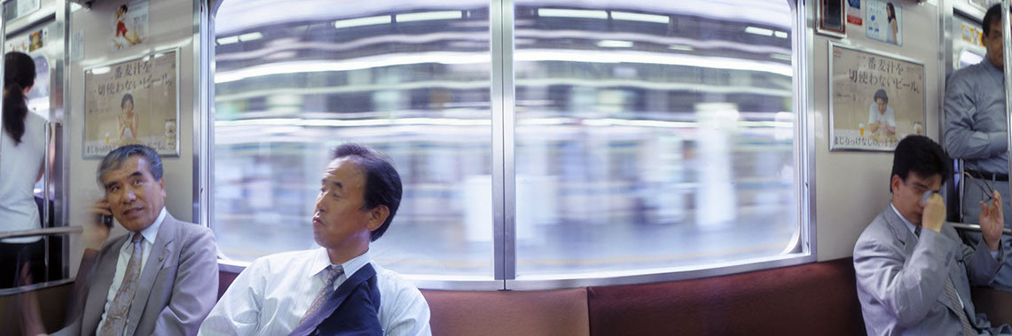 Mittelstadt chooses symbolic locations and situations to develop his discourse on the gaze, on time and space: places which imply not only the concept of physical transit (streets, crossroads,...) but a mental passage, too. In Elsewhere (1999) the notion of linear time is unhinged by the spatial construction of a dialogue. A static panoramic view of the interior of a Tokyo subway car is intersected with glimpses of real life, gestures both tiny and large, authentic physical shifts that belong, depart and die from the instantaneous photographic representation of what is before our eyes: people reading, resting or justlooking back at us.